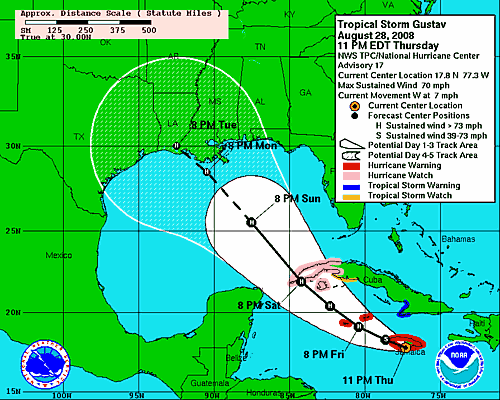 Speaking of New Orleans, here is the NOAA prediction for the most likely path for Hurricane Gustav (actually, it is Tropical Storm Gustav right now, but it should strengthen and become a hurricane again soon).