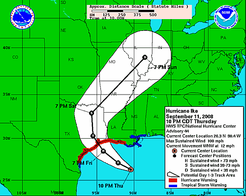 Hurricane Ike is expected to hit the Galveston and Houston areas Friday night or early Saturday morning, perhaps as a category 3 hurricane.
