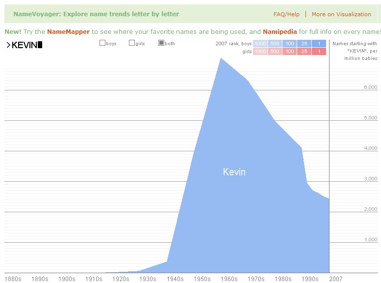 The name Kevin was rare before the 1920s, hit a peak in the 1960s, and has been on a decline since then. The really interesting thing is that Kevin was used as a girl’s name in the 1960s as well, at a rate of about 21 girls per million.