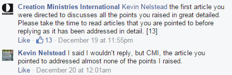 I don’t mind at all that CMI quickly removes the “creationists are morons” sort of rubbish, but they almost go to the other extreme of “No dissent allowed.” Usually when I left a comment on CMI’s Facebook page, CMI responded with something like